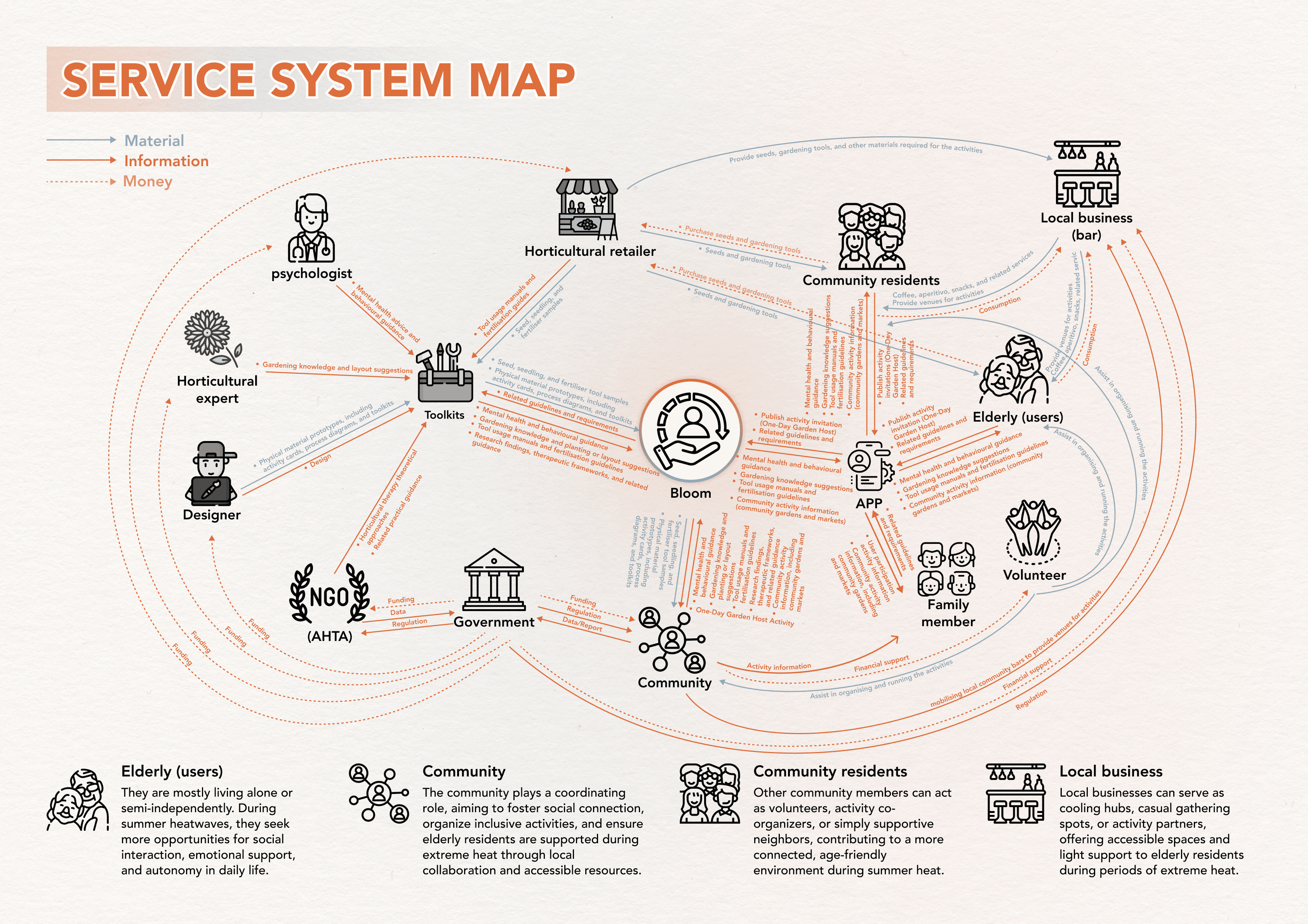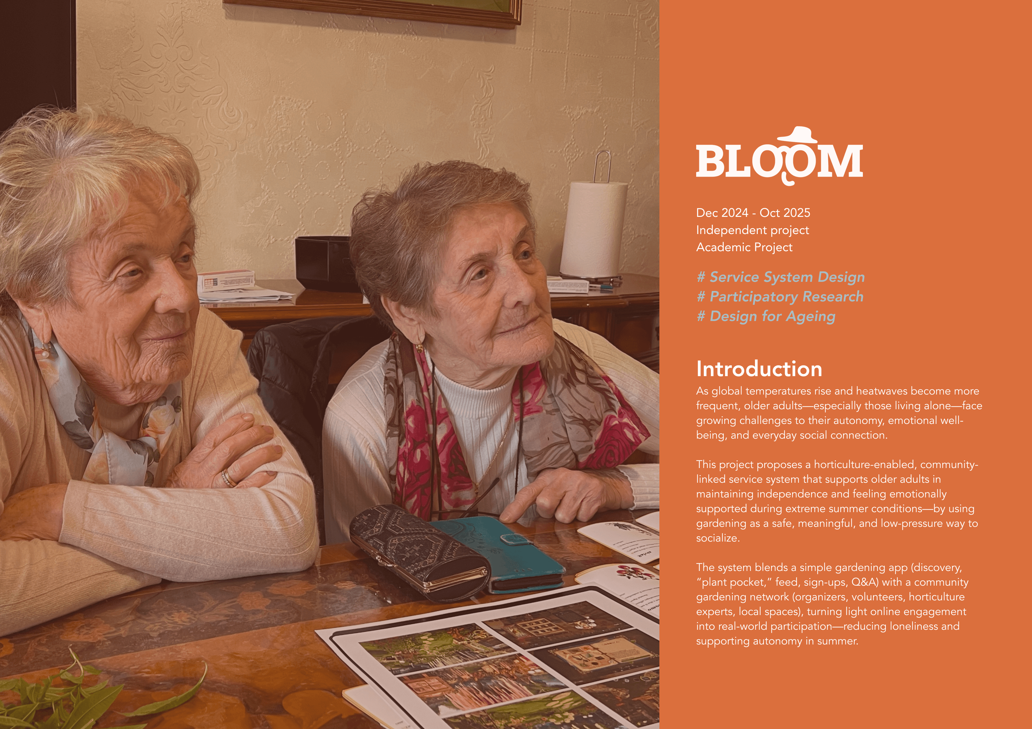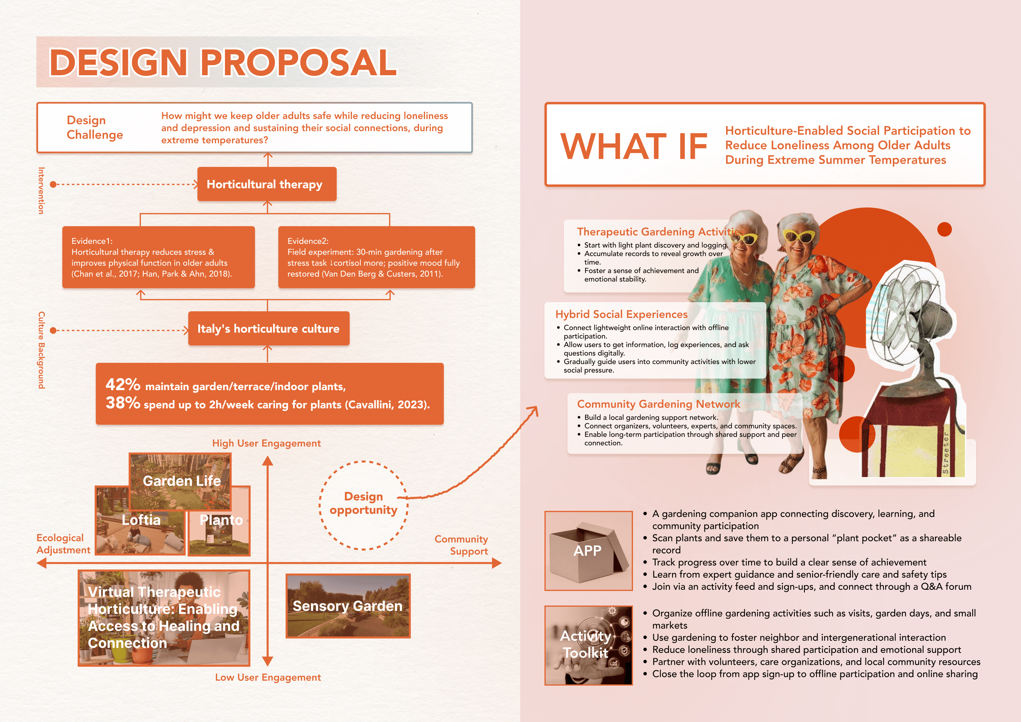 As heatwaves become more frequent, older adults—especially those living alone—face growing challenges to autonomy, emotional well-being, and social connection. This project proposes a horticulture-enabled, community-linked service system that supports independence and emotional care through gardening. It combines a simple gardening app (discovery, plant pocket, feed, sign-ups, Q&A) with a local network of organizers, volunteers, horticulture experts, and shared spaces—supporting everyday engagement and offering safer, extra help during heatwaves to reduce loneliness and protect autonomy.