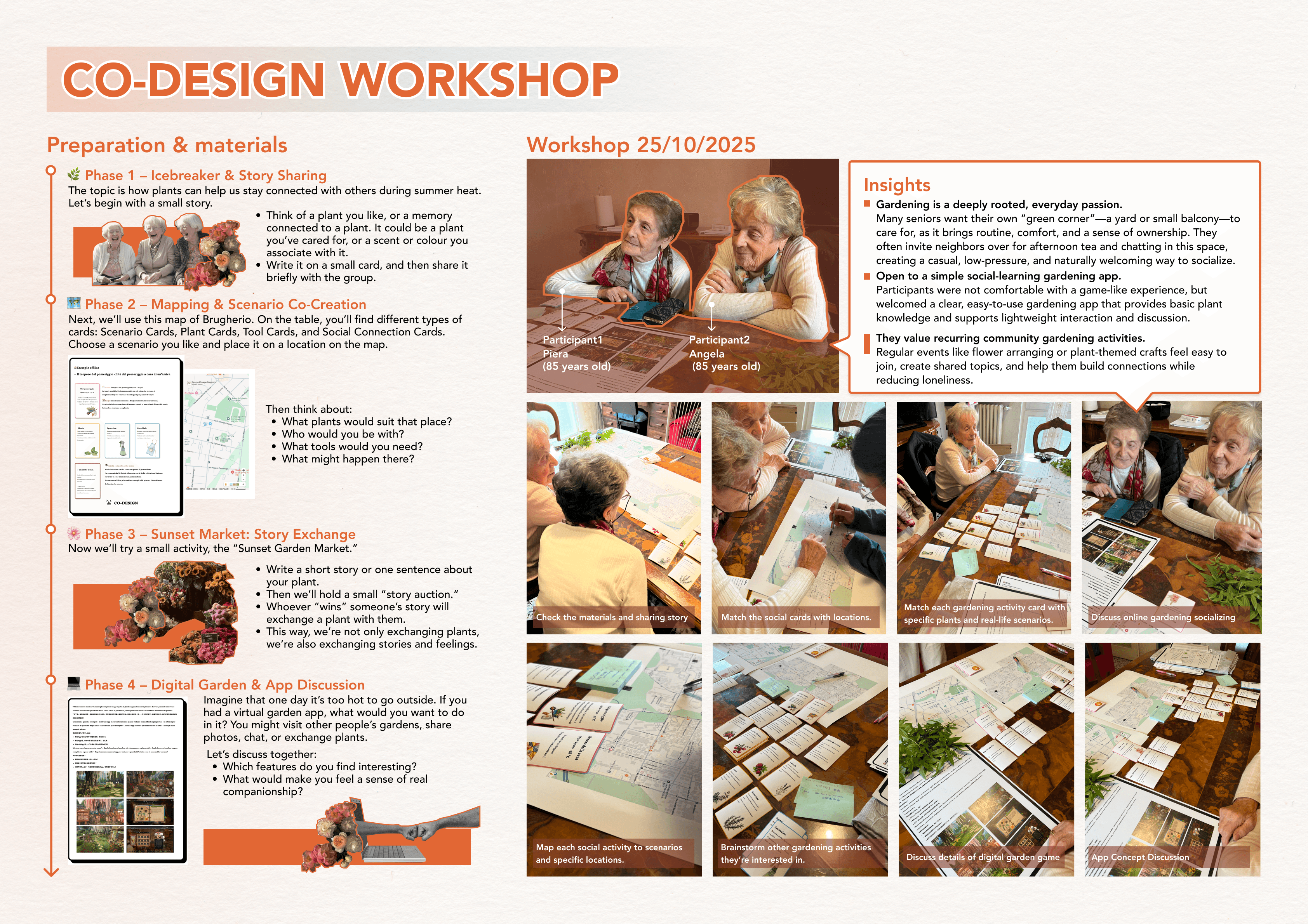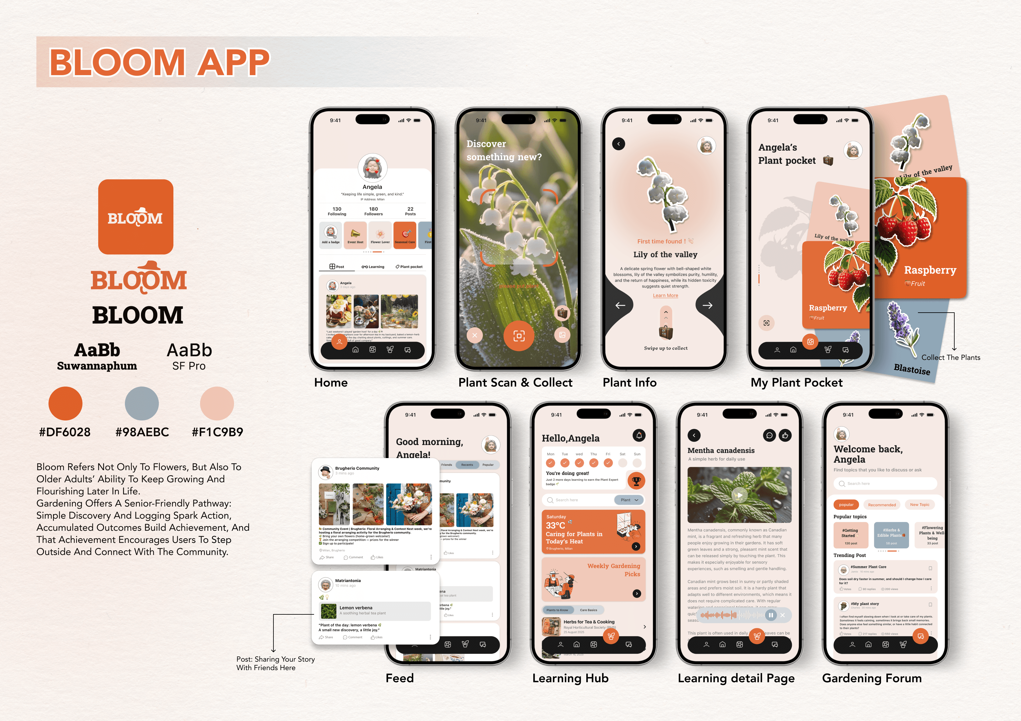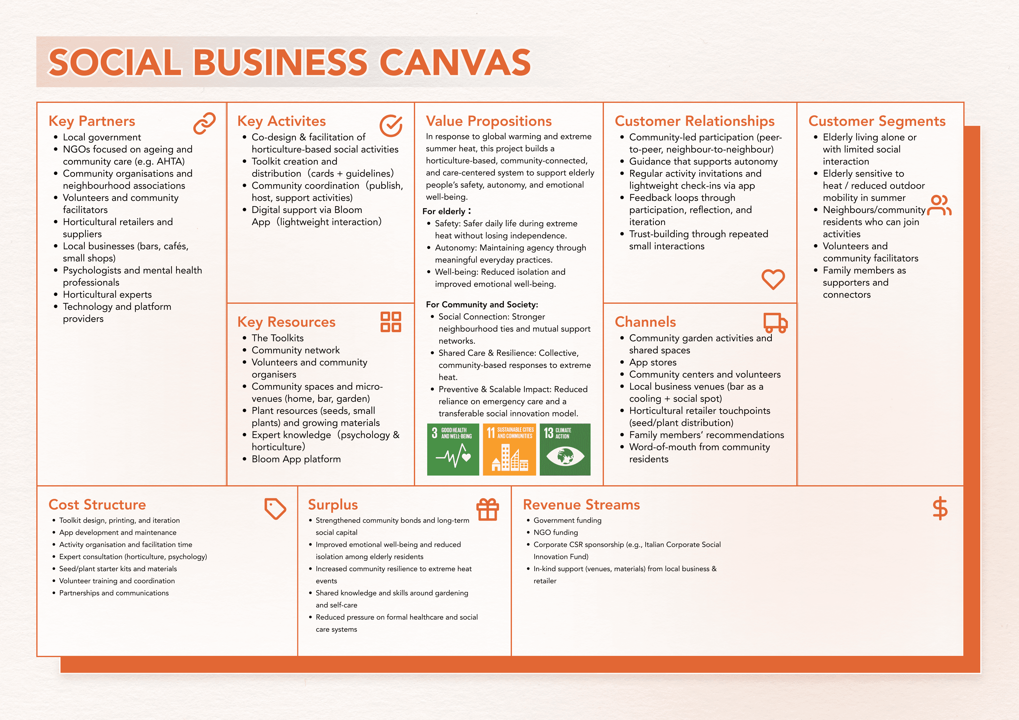 As heatwaves become more frequent, older adults—especially those living alone—face growing challenges to autonomy, emotional well-being, and social connection. This project proposes a horticulture-enabled, community-linked service system that supports independence and emotional care through gardening. It combines a simple gardening app (discovery, plant pocket, feed, sign-ups, Q&A) with a local network of organizers, volunteers, horticulture experts, and shared spaces—supporting everyday engagement and offering safer, extra help during heatwaves to reduce loneliness and protect autonomy.