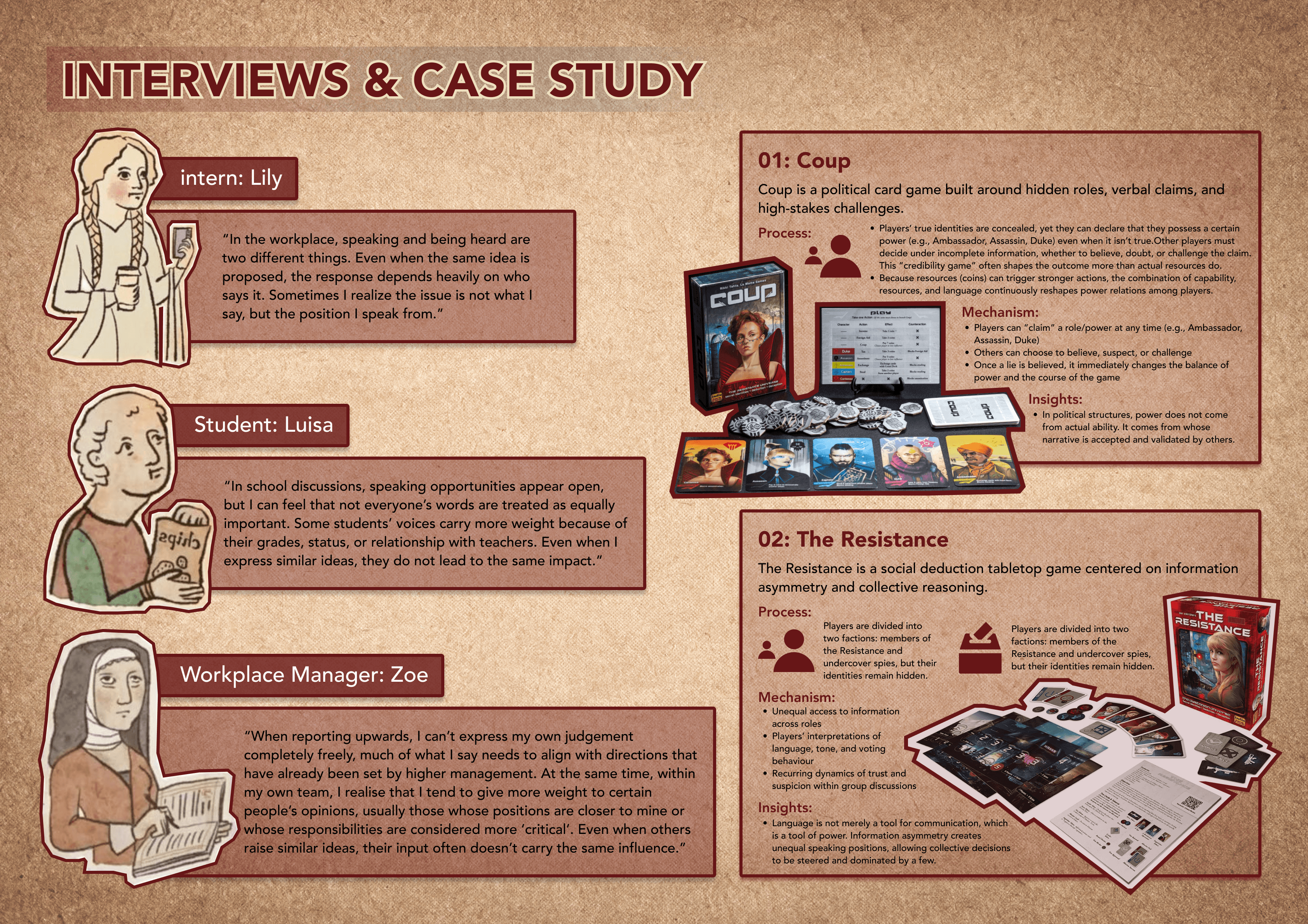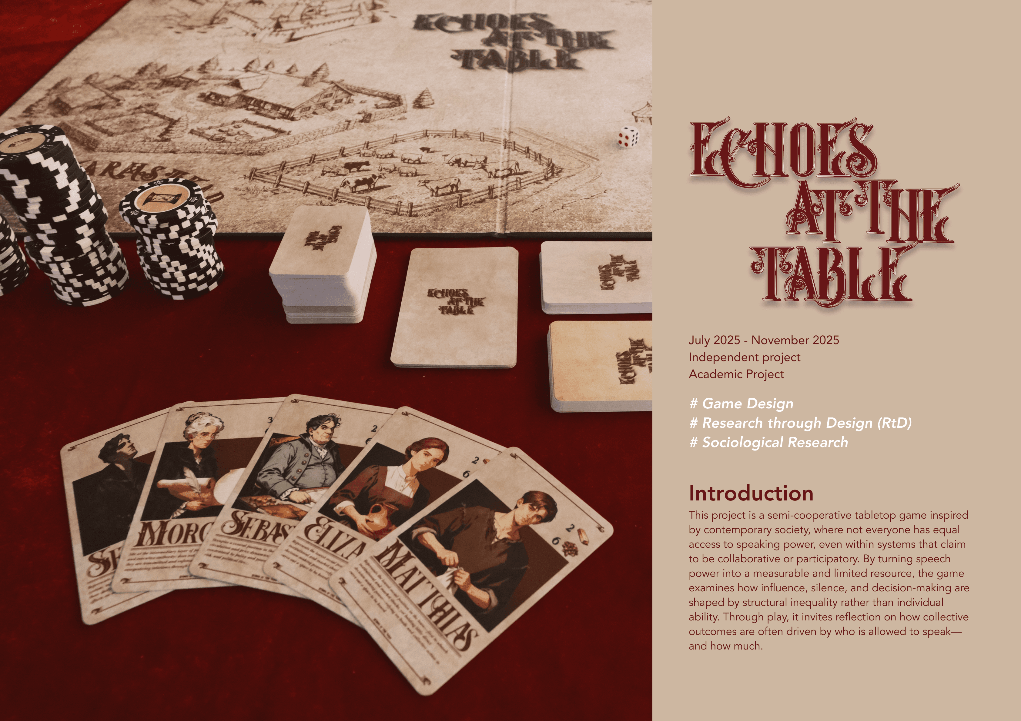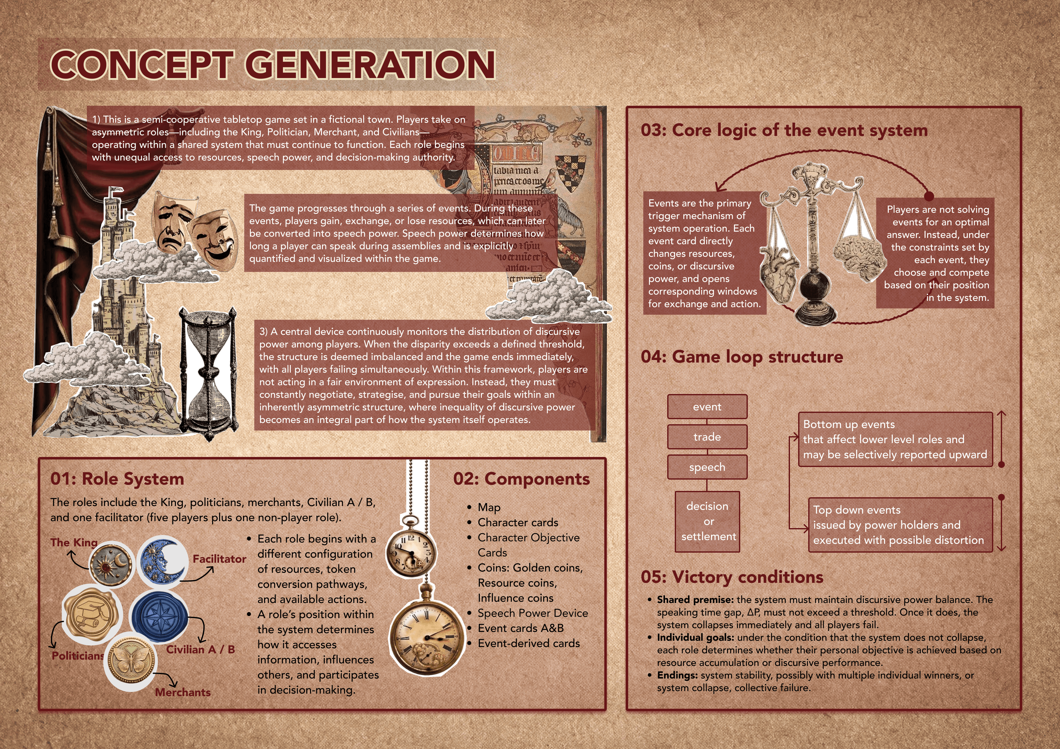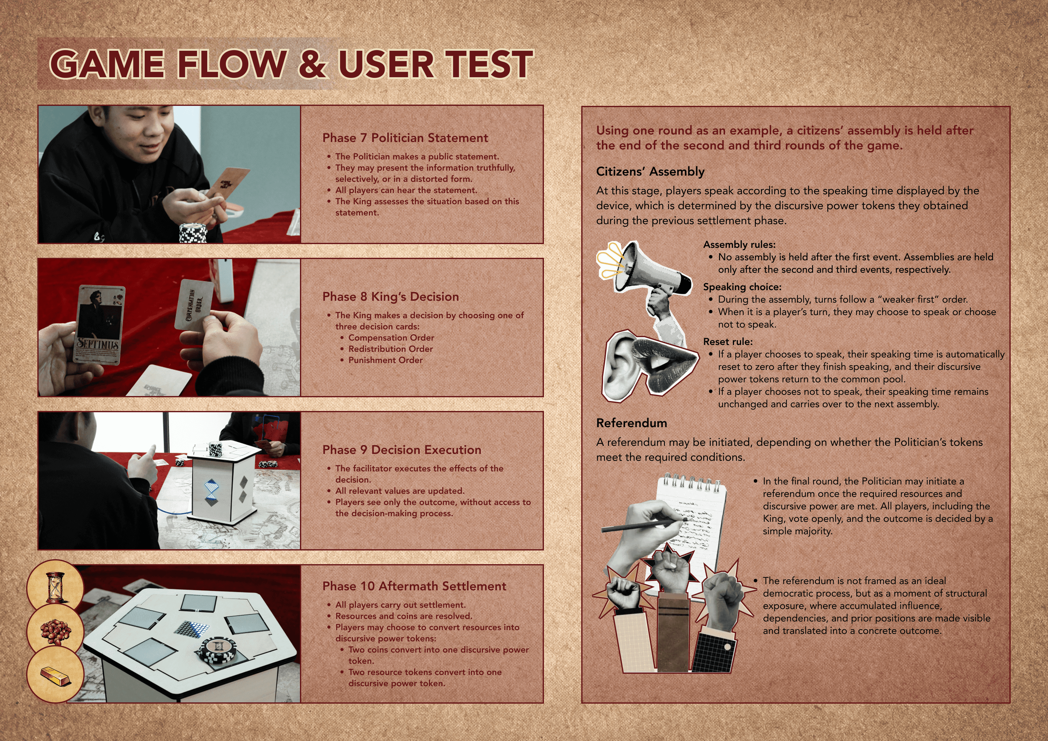 This project is a semi-cooperative tabletop game inspired by contemporary society, where not everyone has equal access to speaking power, even within systems that claim to be collaborative or participatory. By turning speech power into a measurable and limited resource, the game examines how influence, silence, and decision-making are shaped by structural inequality rather than individual ability. Through play, it invites reflection on how collective outcomes are often driven by who is allowed to speak—and how much.