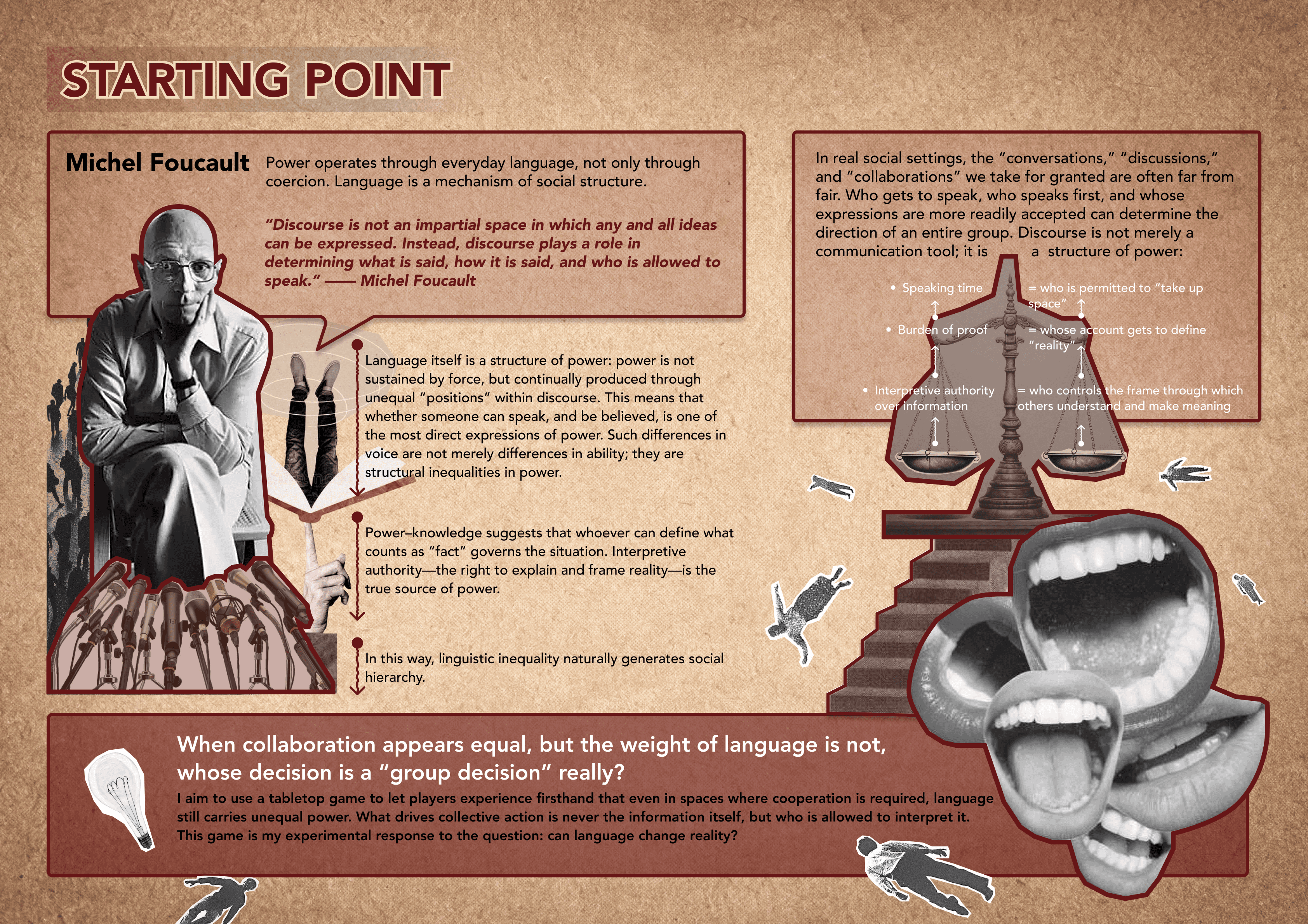 A semi-cooperative tabletop game that explores how speaking power is unevenly distributed, shaping consensus and decisions.