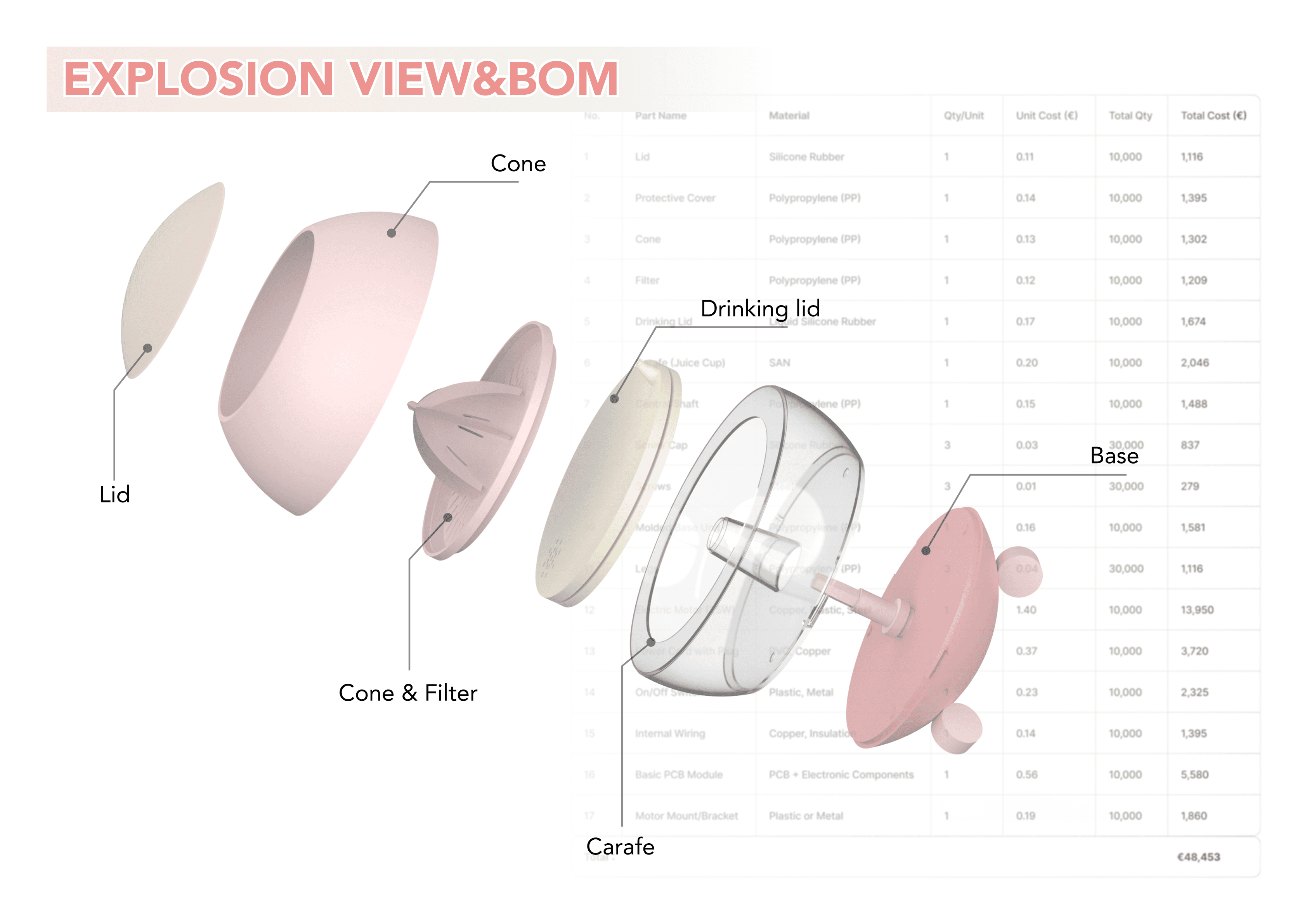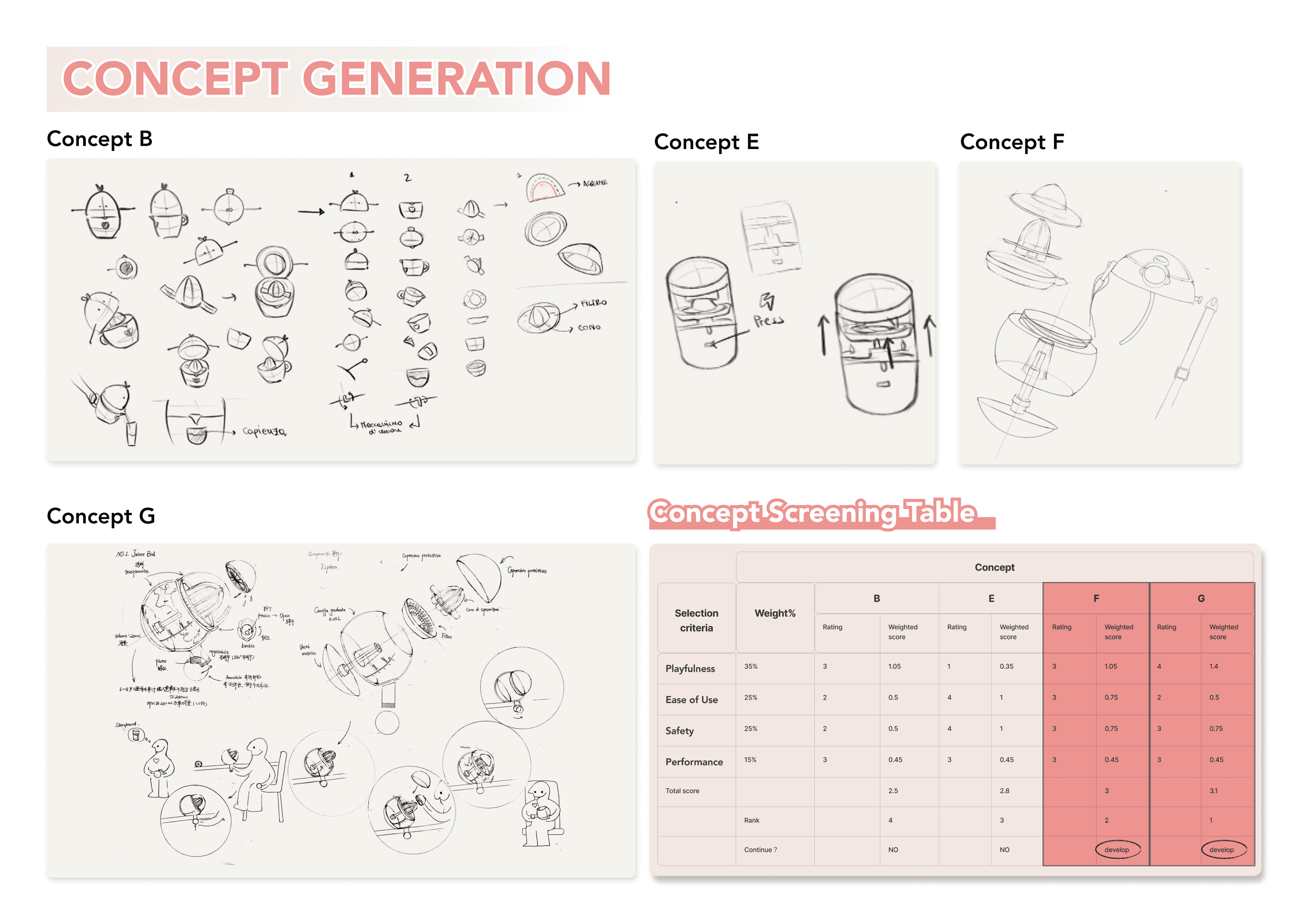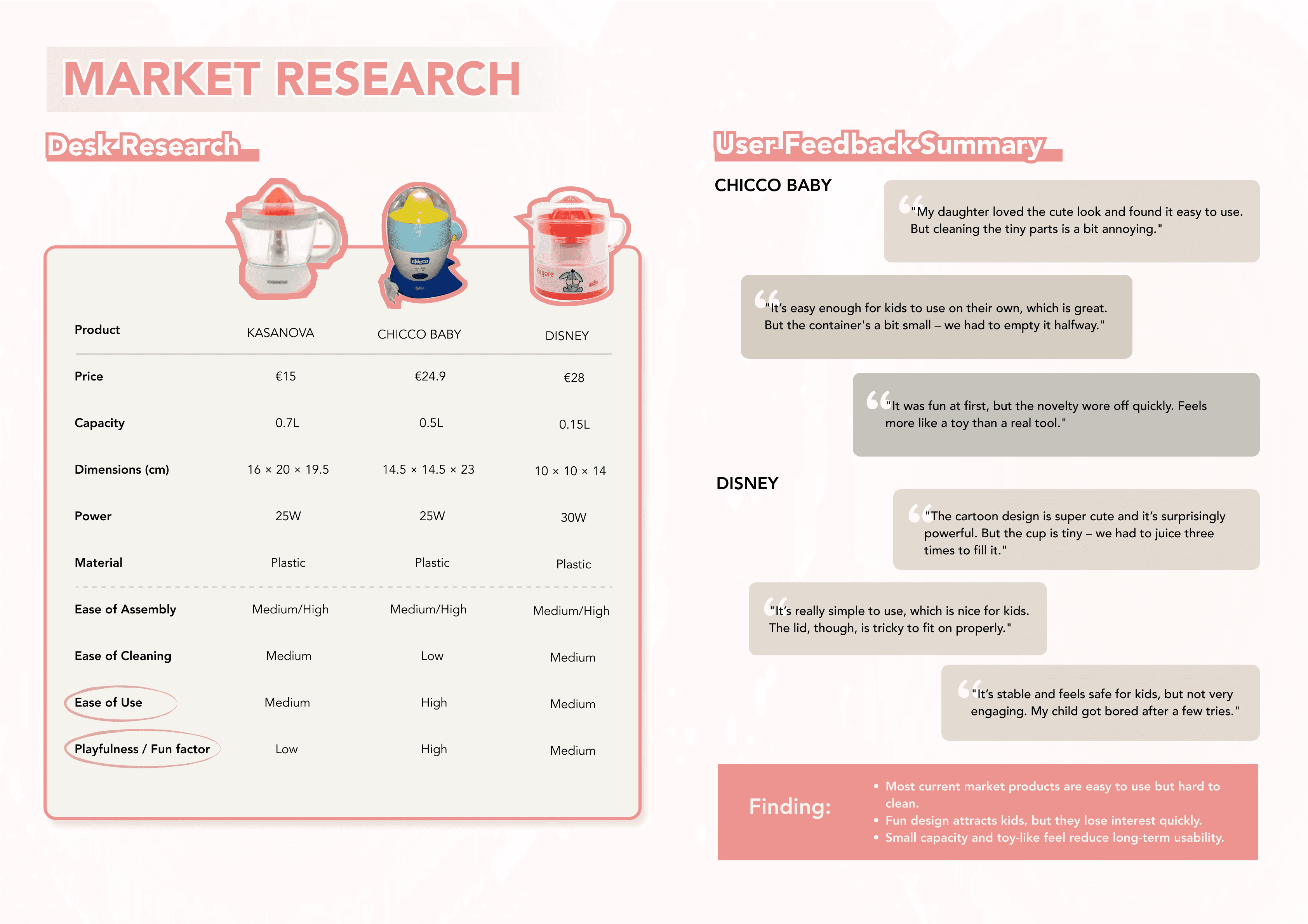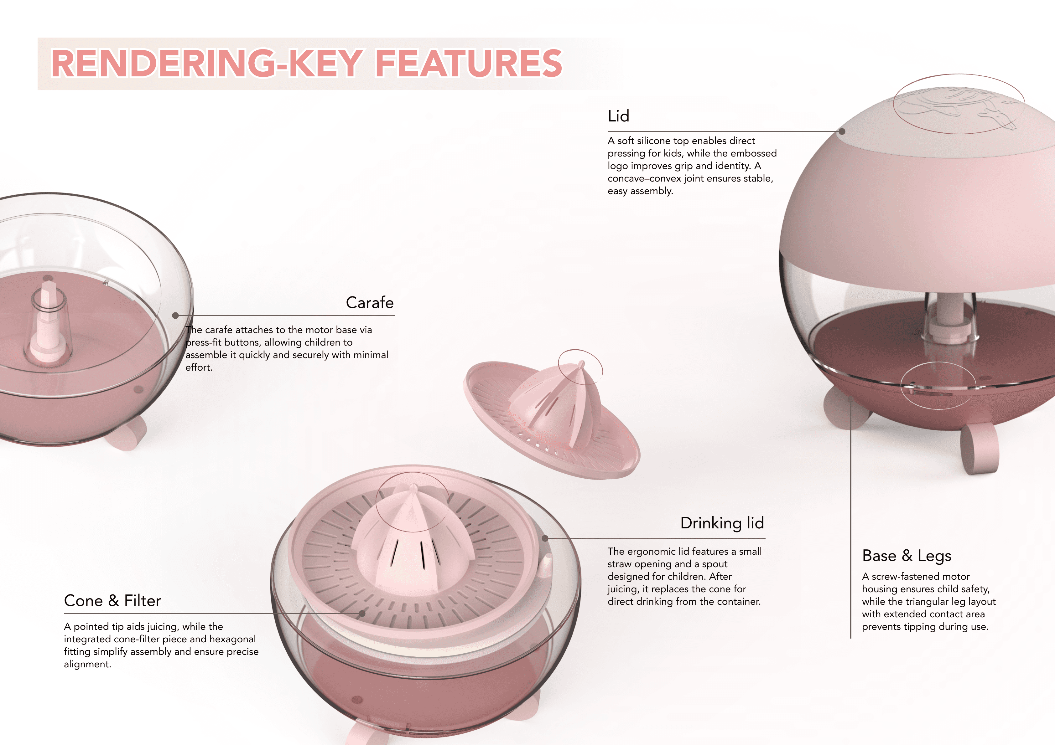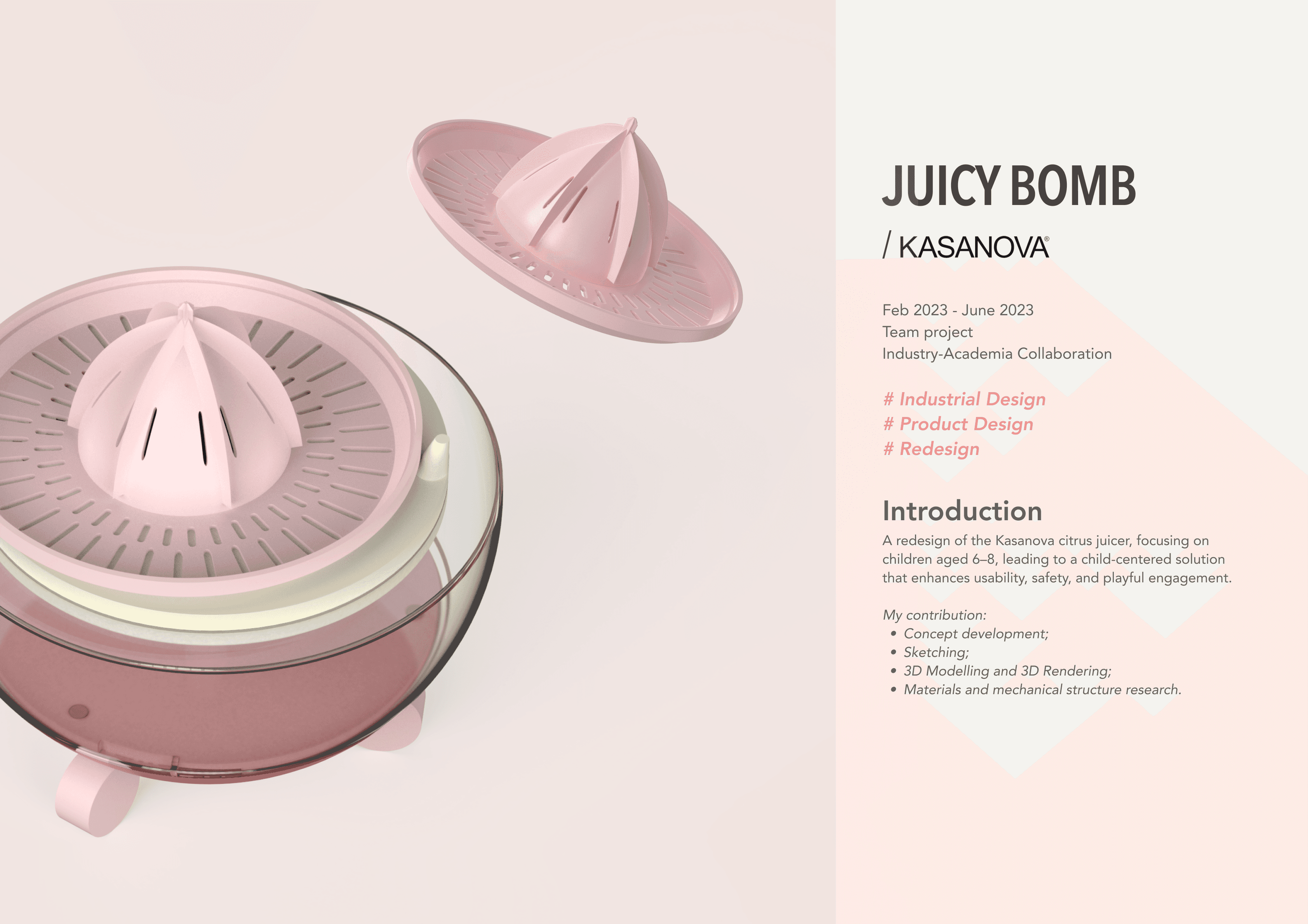 This redesign project targets a gap in Kasanova’s product line by focusing on children aged 6–8 — a stage of strong cognitive and motor development. Through market analysis, surveys, interviews, and observation, we identified key needs and shifted the design toward a younger audience often overlooked in kitchen tools. The final juicer is playful in form and tailored to small hands, while meeting essential criteria of safety, ease of use, and engagement. It turns juicing into a fun and empowering activity, encouraging independence through intuitive interaction.