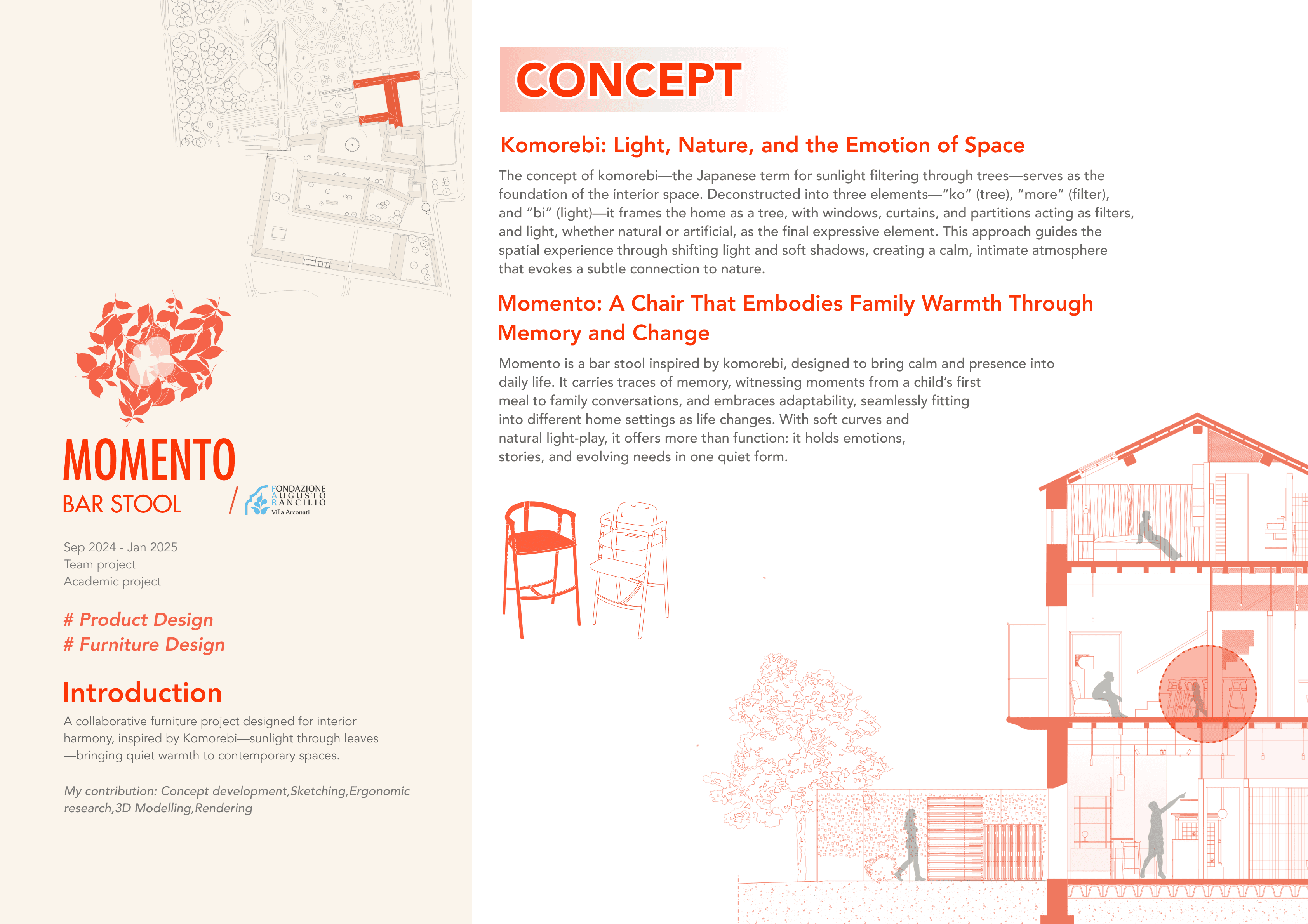 A collaborative furniture project for interior harmony, inspired by Komorebi—sunlight through leaves—adding quiet warmth.